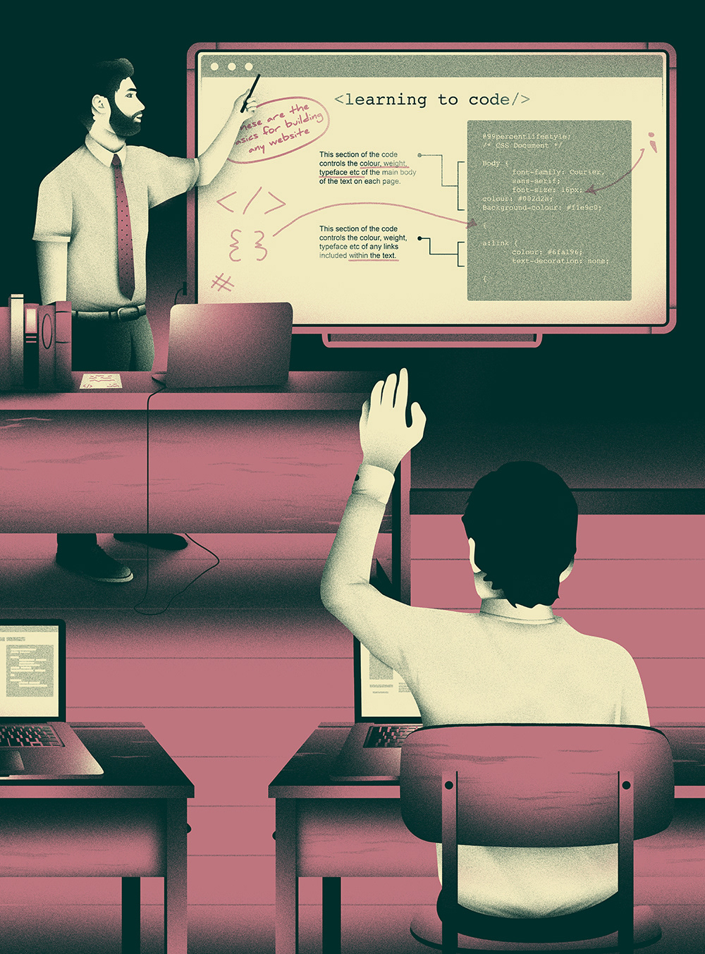 This piece is two of two illustrations that are accompanying an article on coding and learning to code.