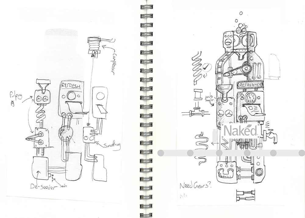 Initial sketches for the project - Trying to make the factory actually 'work' proved to be the hardest part - I wanted to be able to follow the path of the fruit from when it went in at the top, to when it came out as a smoothie at the bottom.